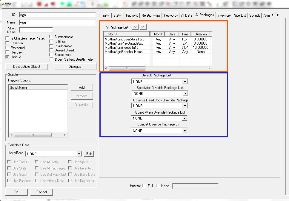 順に、「他人同士の戦闘を見物(やじ馬)」「死体発見」「警告時」「戦闘時」の限られたシチュエーションでのみ動作する特殊なAI Packageです。これらはAI Package ListやDefault Package Listより高い優先度で自動的に実行されます。これらの欄が「NONE」の時はデフォルトで指定された動作を行います。