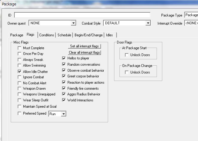 AI Package がスタートした時や、次のPackageへ切り替わる時(?)に、NPCが目的地としているセルへ通じる扉を開錠するフラグのようです。場合によっては、NPCが帰宅する前に家の鍵が自動的に開く不思議な事態が発生します。