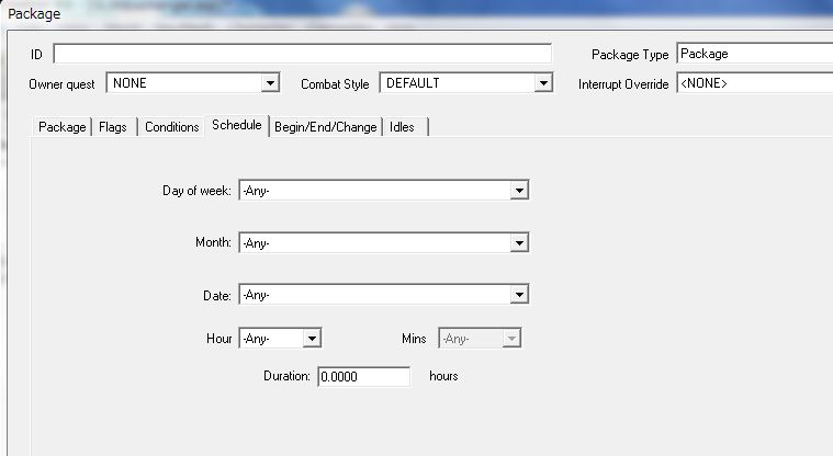 AI Packageを実行する日時を指定できます。ゲームシステムは、ここの設定とConditionsのタブの条件から、AI Packageを実行するかどうか判定しています。
