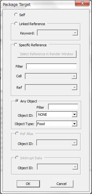 - Any Object:ObjectIDの項目で、BaseIDからオブジェクトやファクションなどを選択。もしくはObject Typeから「Food:食べ物全般」「Weapons: Melee: 近接武器全般」などオブジェクトを種別で指定可能。文字通りオブジェクトの型で見分けているらしく、Modで追加されたものも認識できます。