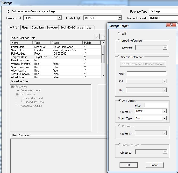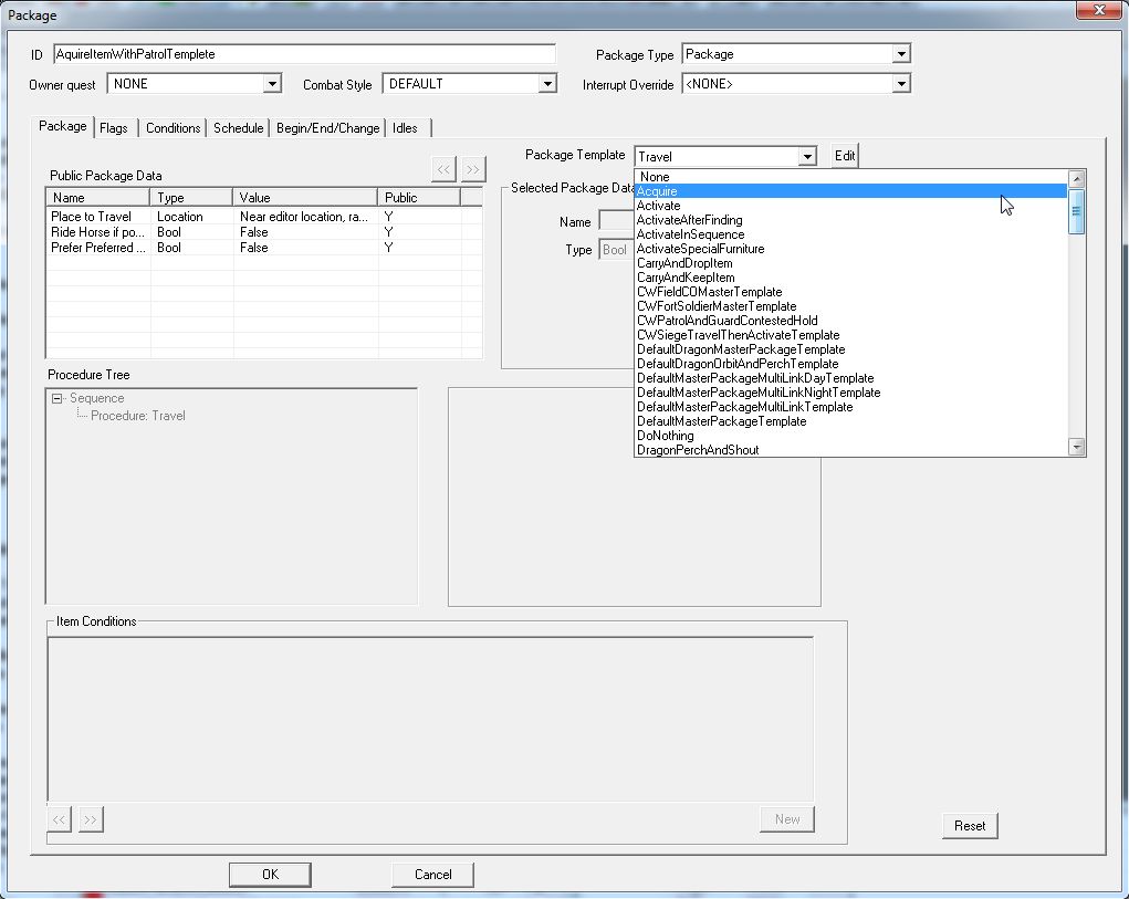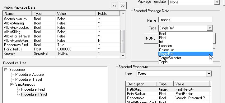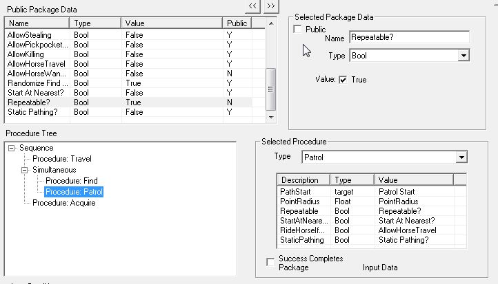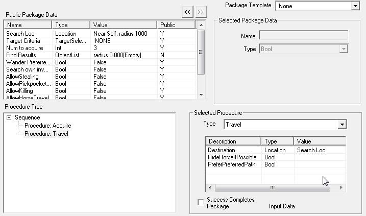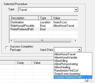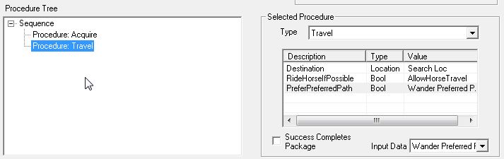 "Procedure: Travel"は、"Destination"が必要不可欠と思われます。他は特に設定しなくてもよさそうなのですが……。パラメータが足りないと、CKがエラーを出したりProcedureが稼動せずNPCが棒立ちになったりするので、すべてのパラメータに具体的な値を用意してあげるのが無難です。