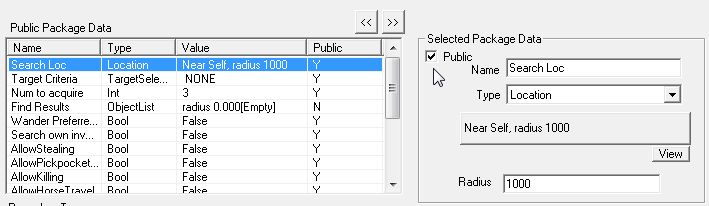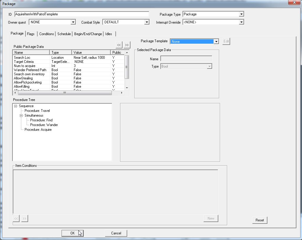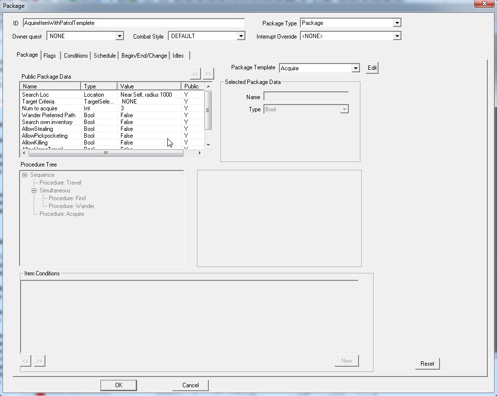 "Acquire"は、指定された場所で指定されたアイテムを探して取るPackageです。「Public Package Data」の項目を見ると想像がつきますが、アイテムを取得する際に、「盗みを許可する」「スリを許可する」「殺してでも奪い取る」などのオプション設定をつけることができます。