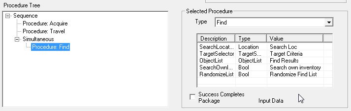 "Procedure: Find"を追加します。各パラメータに「Public Package Data」の項目を適切に割り当てます。