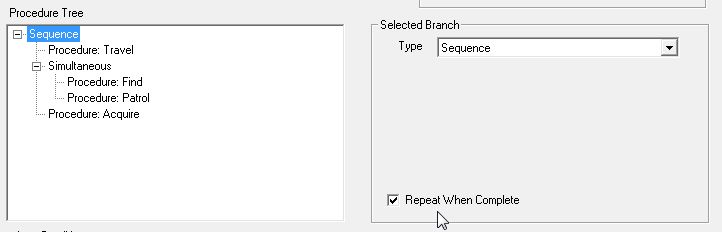 新たに追加した項目"Repeatable?"のみチェックをはずし、ValueのTrueにチェックしておきます。これで"Procedure: Patorol"は指定されたPatrolマーカーを延々と往復するようになり、終了しないタイプのProcedureになります。今回作ったProcedure Treeにはこの設定が適しています。