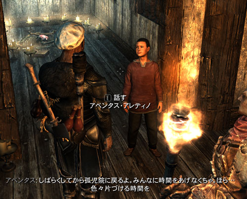 クエスト「失われた無垢」の終了前まではダイアログから彼を誘うことができるのですが、クエスト完了後は、話しかけても一切のダイアログが出なくなってしまいます。何度話しかけてみても、「大人になったら暗殺者になる」と「しばらくしてから孤児院に戻る」の話しかしてくれません。