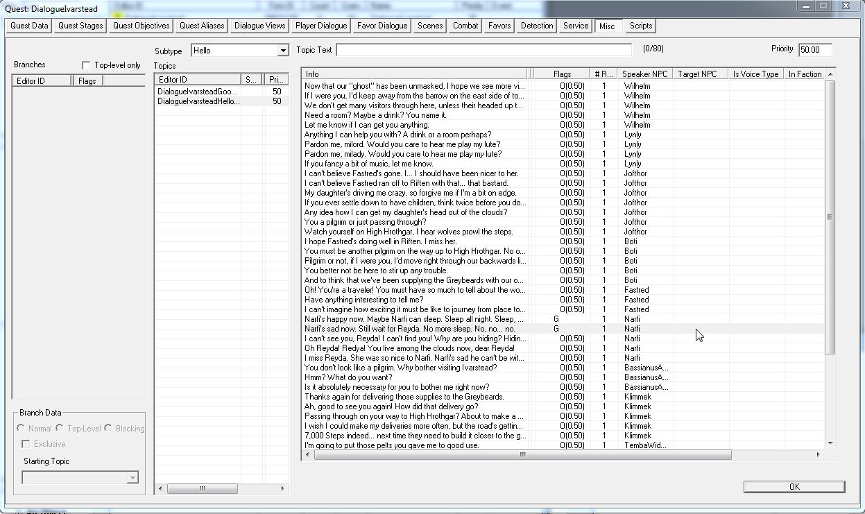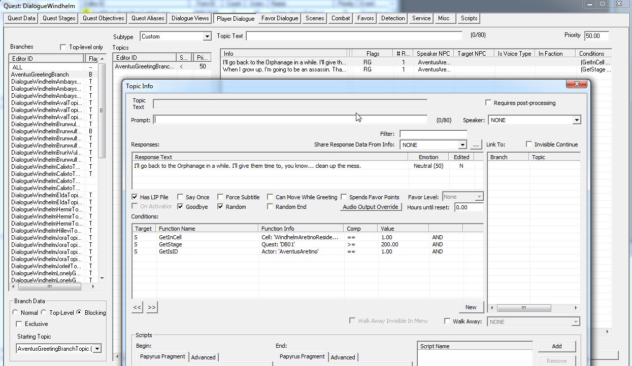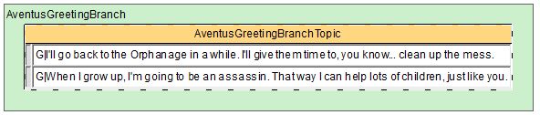 彼の例のセリフは「DialogueWindhelm」というクエスト内で管理されています。「Player Dialogue」というタブ内にある「AventusGreetingBranch」というDialogue Branchです。
