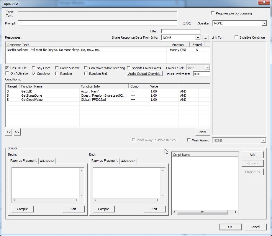 Misc」タブ、Hello Topicにクエストクリア後の「眠れない」「眠れる」の2パターンの台詞を発見。Flagsの項目を見ると、この二つの台詞だけ他のTopicとまったく異なっているのが分かります。