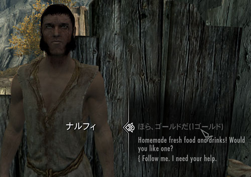 似たようなことは、イヴァルステッドのナルフィにも起こります。「レイダの亡骸を捜す」一連のクエストを終了後、ナルフィに話しかけても特定の台詞しか言わなくなり、クエスト前に出ていたお金を恵む選択肢などダイアログが一切出ない状態になります。