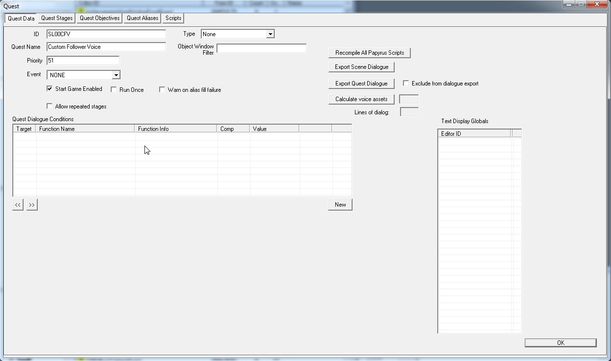 これらのセリフに加え、ミラベル、アンカノのボイスタイプは、Priority「0」のQuest「DialogueGenericUniqueVoices」で一般的な受け答えや戦闘用のセリフが用意されています。フォロワーになっていてもこのQuestに登録されたセリフを話してほしいので、自作Questに登録するセリフは全てRandomや「Hours until reset」を設定し、「DialogueGenericUniqueVoices」のセリフを再生できるようにします。