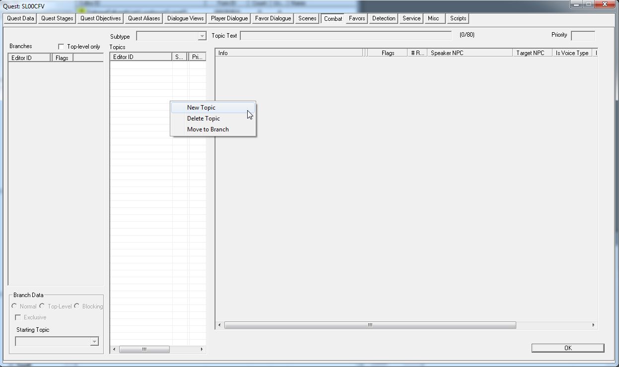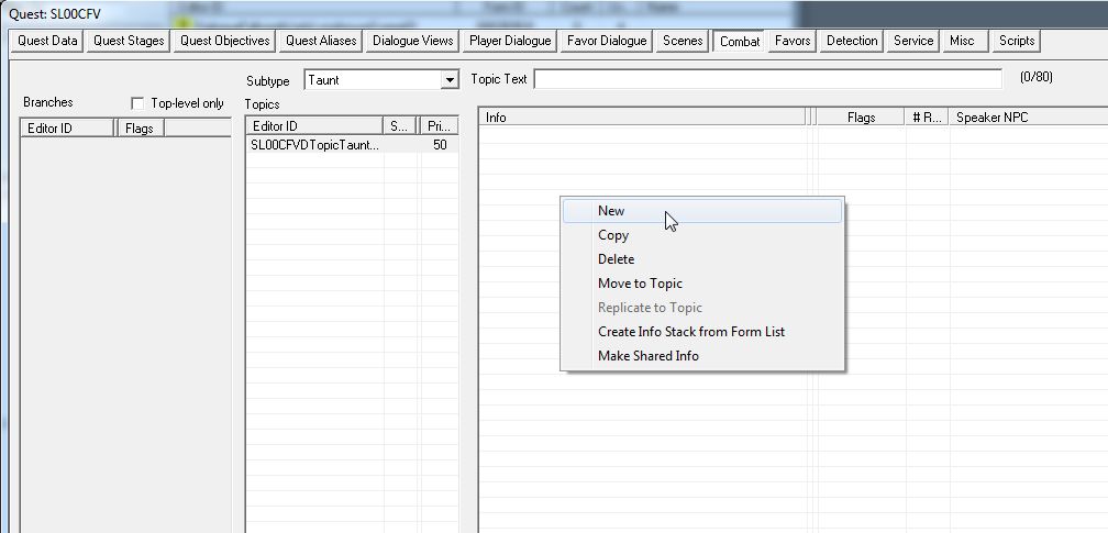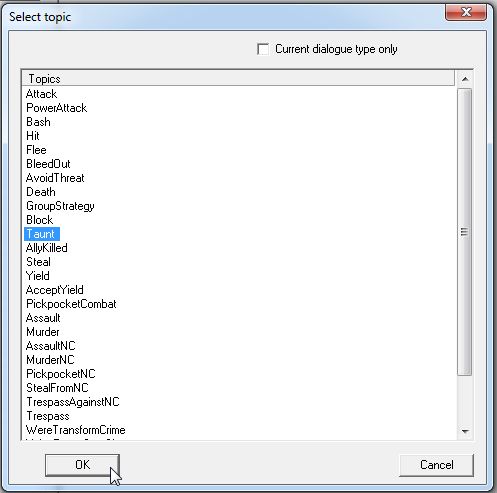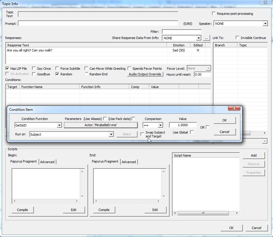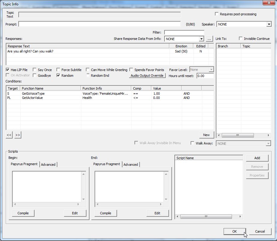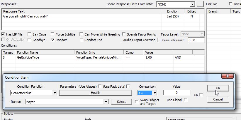 次に、セリフが話される条件やRandomなどの設定を行っていきます。今の状態ではなんのConditionも設定されていないので、Skyrimの全てのNPCがこのセリフを戦闘中に話すことになってしまいます(