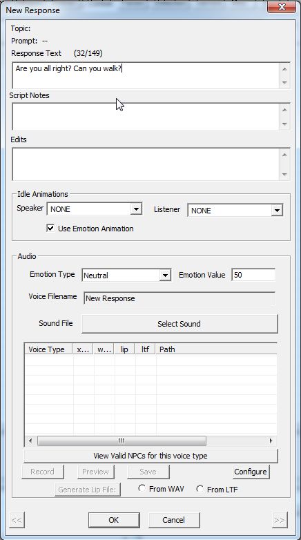 セリフ(Info)ができました。複数行にわたる長いセリフは、上のResponse欄の中で右クリックしてNewを選ぶと、2行目以降のセリフが登録できます。