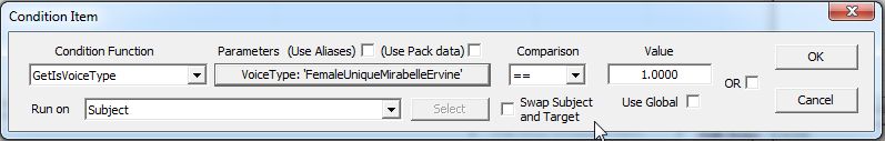 Actorを直接指定してセリフを話すNPCを制限する方法があります。万一、ミラベルと同じ声を使ったカスタムフォロワーが別にいても、そのフォロワーにこのセリフは適用されません。一番間違いがない設定かと思われます。