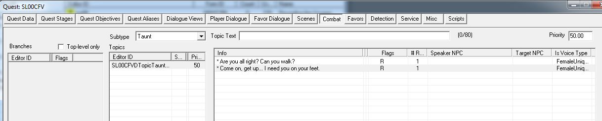 一般的な戦闘中のセリフは「DialogueGenericUniqueVoices」が全て引き受けてくれるので、このQuestでは追加の挑発用セリフや変則的なセリフを扱うことができます。