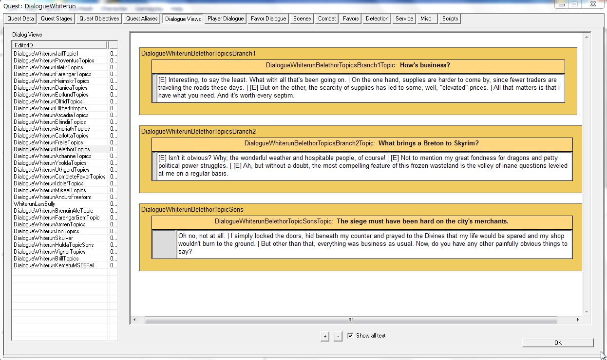 今度はQuest「DialogueWhiterun」の「Dialogue View」を見てみます。ホワイトラン住人達が持つ会話選択肢が、いくつかのViewに分類されて並んでいるのが分かります。