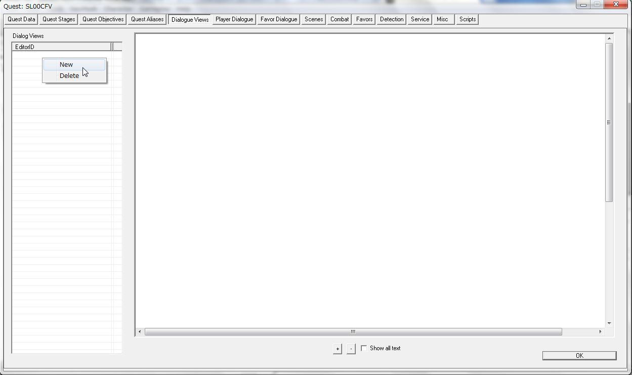 ただし、「Start Game Enabled」にチェックの入ったQuestに選択肢のある会話があると、ゲーム開始直後やMod導入直後に、会話選択肢が出ないという問題があります。一度セーブしてゲームを終了、ロードすれば選択肢が出ます。もしくはSEQファイルを作成することで、ゲーム開始直後、Mod導入直後でも選択肢を出せるようになります。