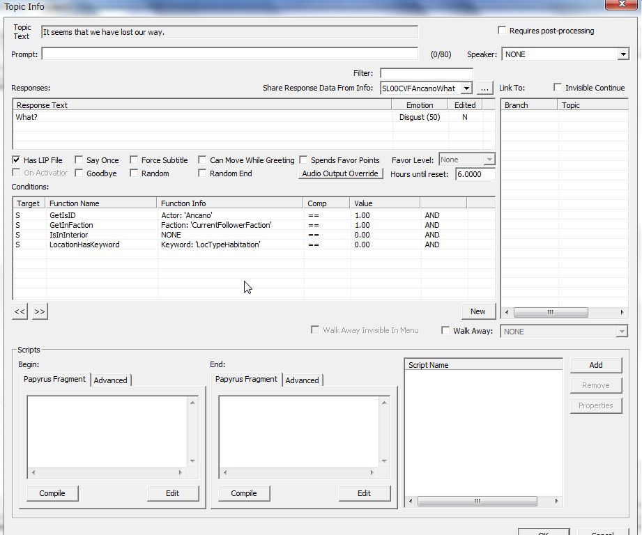 Conditionsには、話者がアンカノ、フォロワー用ファクションに入っている、屋内にいない、町や村のロケーションにいない、を設定しました。人里離れた野山や屋外扱いのダンジョンなどでのみ「道に迷った」という選択肢を出すという想定です。