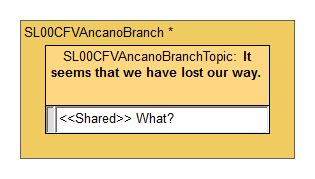 上の例では、「ここはお前のいる場所じゃない」という、不法侵入中のInfoがあります。この会話が出ると相手がフォロワーでも商人でも、他の会話が一切できなくなった経験があるかと思います。Bloking Branchで他の会話が追い出されてしまったためです。