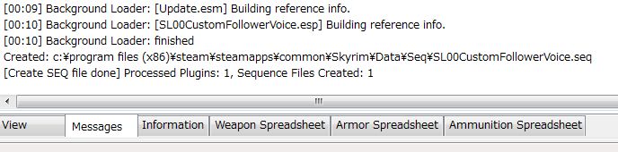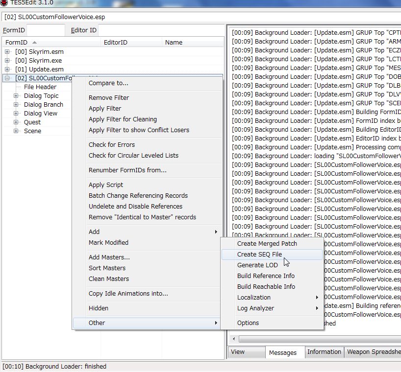 TES5Editで自作セリフModを読み込み、選択して右クリック>Other>Create SEQ Fileです。