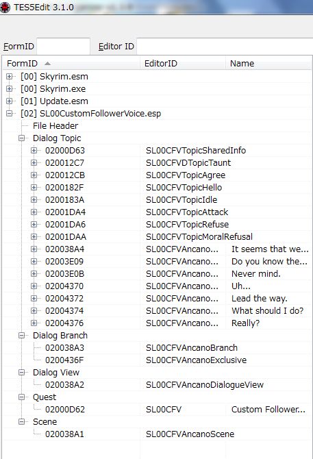 DLCハースファイア、ドラゴンボーンでもフォロワーのセリフが「DialogueFollower」に新規追加されおり、Modを作る上で参考になります。人によってDLCの導入状況は異なるため、競合が起きにくいように配慮されているようです。