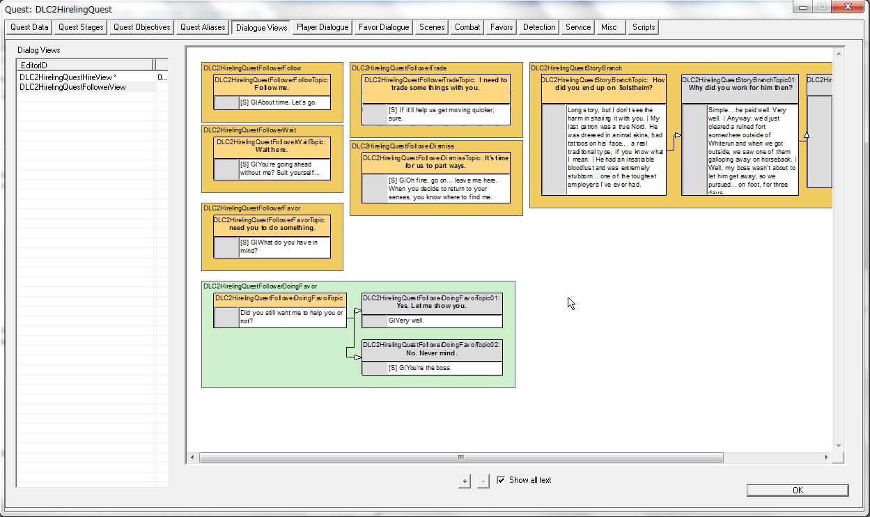 テルドリン・セロの雇用中のセリフを一手に引き受けるQuest「DLC2HirelingQuest」も参考になります。