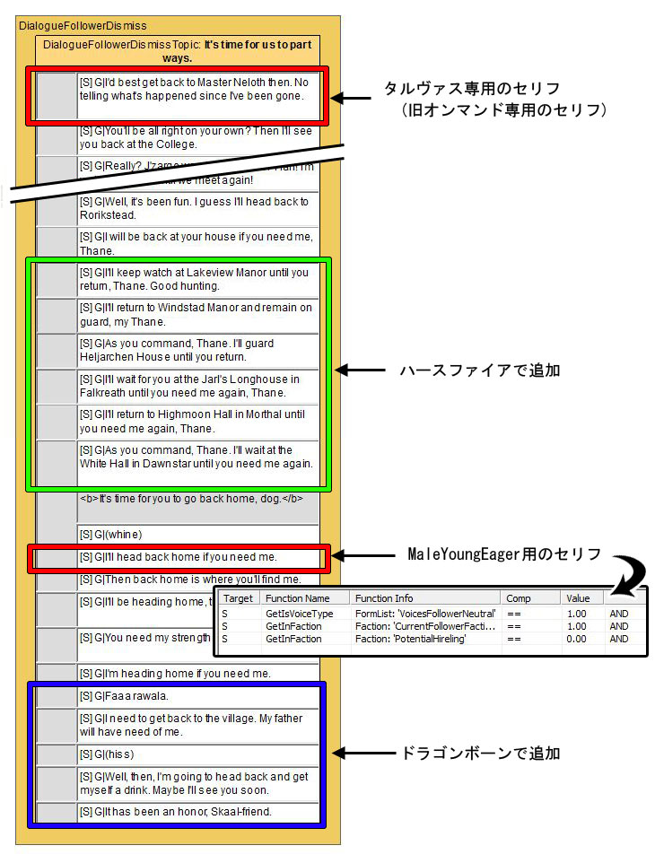 上図はドラゴンボーンで追加される、フォロワーと別れる時のセリフ。ハースファイアでも、3名の私兵の固有セリフが、既存の私兵用セリフの下に挿入されています。
