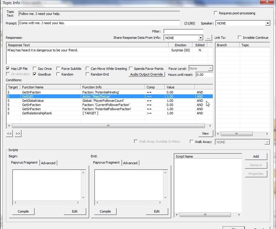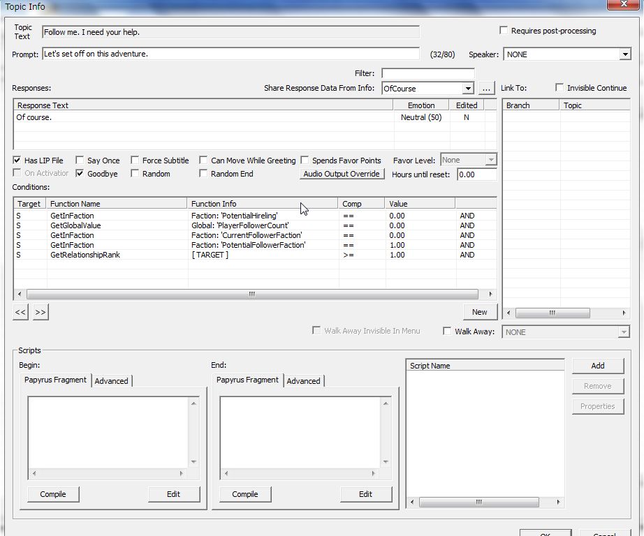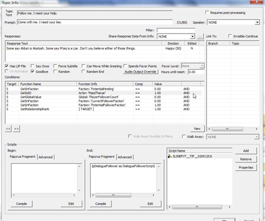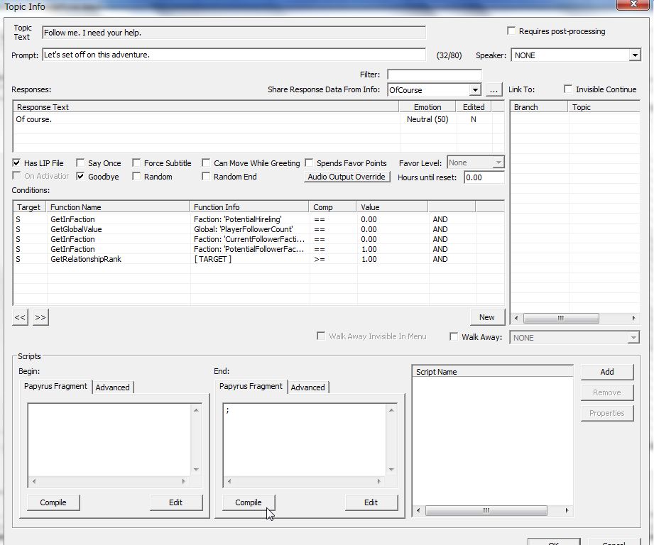 さて、雇用セリフにはNPCをフォロワーにするScript処理が必要です。既存の雇用セリフについているScriptと同じ内容を自作Infoにも取り付けます。