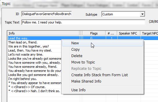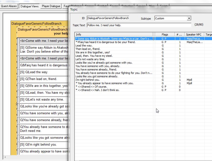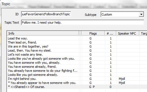 ユニークボイスやカスタムボイスのフォロワーには、雇用会話だけ新規Topicを作成するしかなさそうです。これはテルドリン・セロと同じタイプのフォロワー用Questを作ることになるので後回しにします。