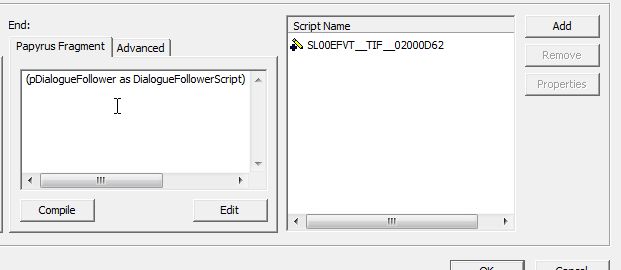バニラのフォロワーQuestを変更しているフォロワー拡張ModではScriptの内容が違うことがあります。そちらと互換を取りたい場合は、マスターファイルとしてフォロワー拡張Modを読み込んでから作業することになります。