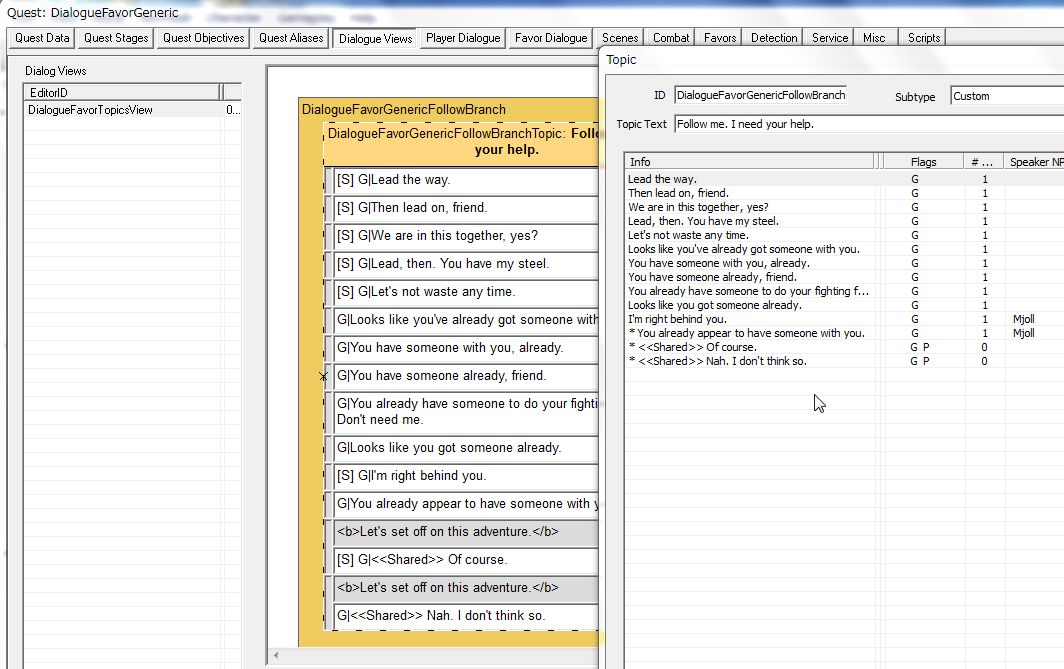 まず最初は、Quest「DialogueFavorGeneric」にある雇用の会話にセリフ追加しようと思います。