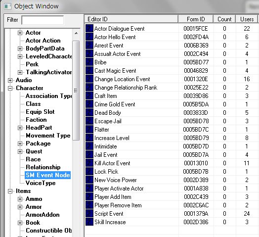 監視しているイベントは上図のとおり。「二人のNPCが近づいた(Actor Dialogue Event)」「逮捕された(Arrest Event)」「プレイヤーが場所移動を行った(Change Location Event)」などなど。