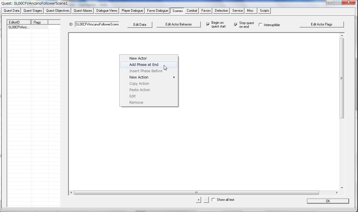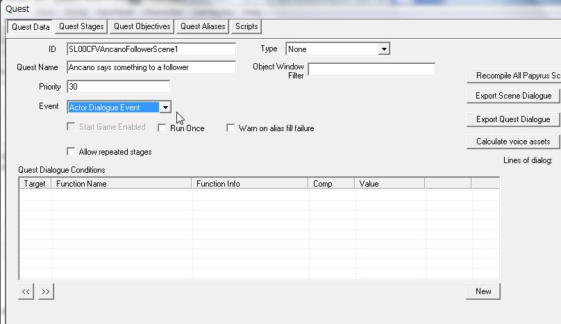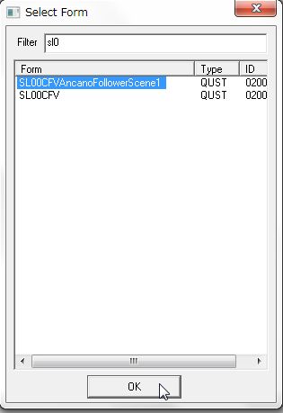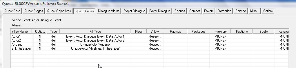 「DialogueWhiterunFraliaLillithScene1」など、既存の会話専用Questをお手本に作ります。だいたい「Dialogue(居住地の名前)(出演NPCの名前)Scene」という名前でたくさんの既存Questがあります。