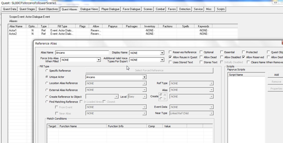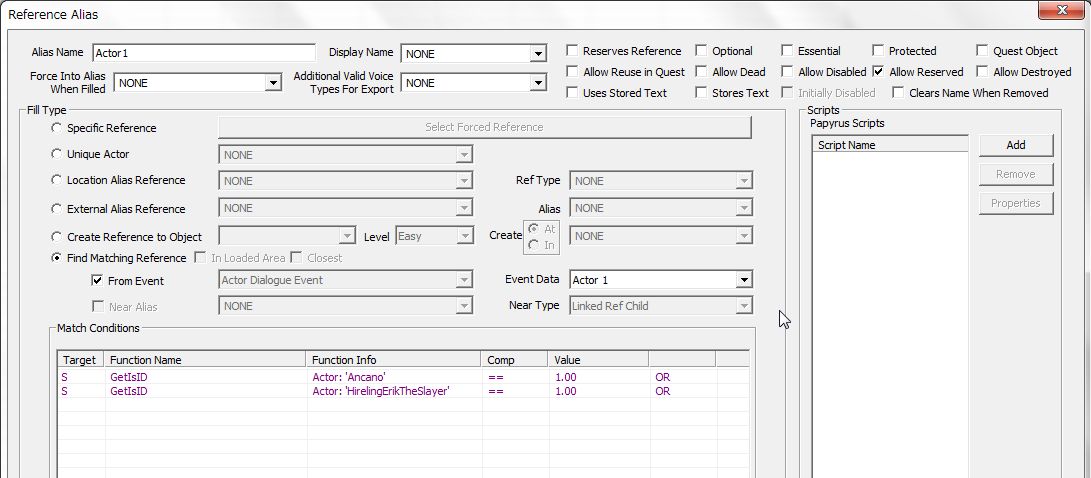 「Allow Reserved」のところにチェックを入れます。他Questの「Reserves Reference(予約済み)」にチェックの入ったAliasが適用されているNPCでも、強制的にこのAliasに突っ込めるようになります。