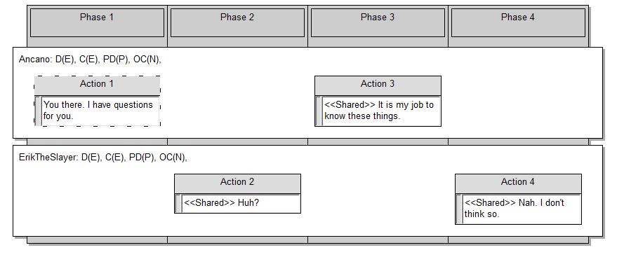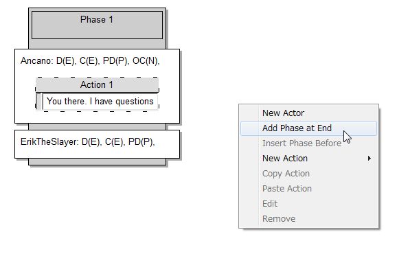今度は、エリクの返答を追加します。アンカノのセリフが終わった後で言って欲しいので、Phaseを追加。アンカノにセリフを追加したのと同じようにやっていきます。