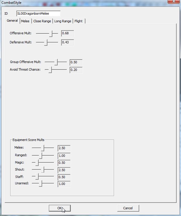 というか、他の設定値は接近戦用、遠隔攻撃用の他のCombatStyleを参考に、なんとなく設定すれば、なんとなくそれっぽく動いてくれる、という感じだっただけとも言います。
