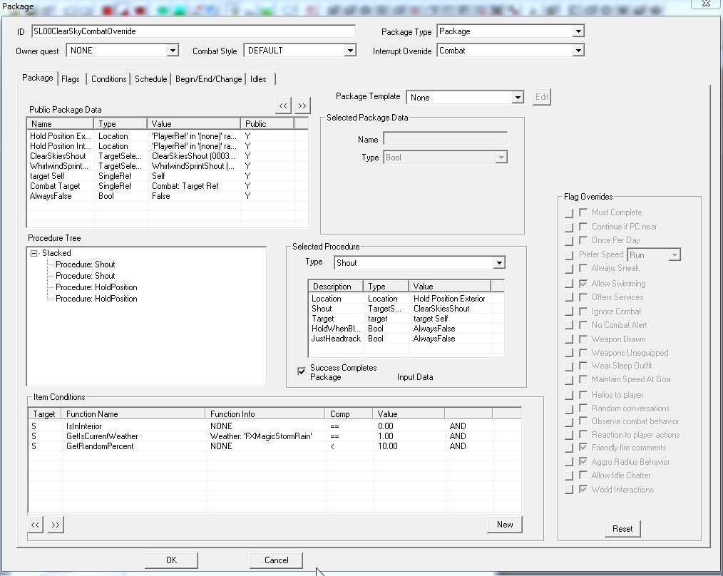そこでCombatOverrideを作って、こんな感じで「ストームコールによる天候変化」がおきている場合「10%」の確立で「晴天の空」を撃ってもらうProcedureTreeを作ってみました。作ってみたのですが、このProcedureTreeが何秒単位でStackedの条件をチェックしてくれるのか分からないので、何を持って「10%」の確率かはよく分からないんですが。