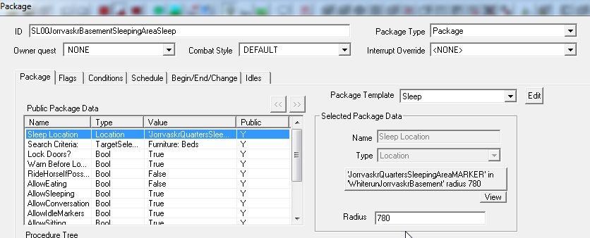 ソリチュードの「ウィンキング・スキーヴァ」では、傭兵ベルランドさんがいつも座っている椅子をLocationとして選びました。この椅子はベルランドのAI Packageですでに参照されているオブジェクトなので、セル変更を加えずに指定することができます。