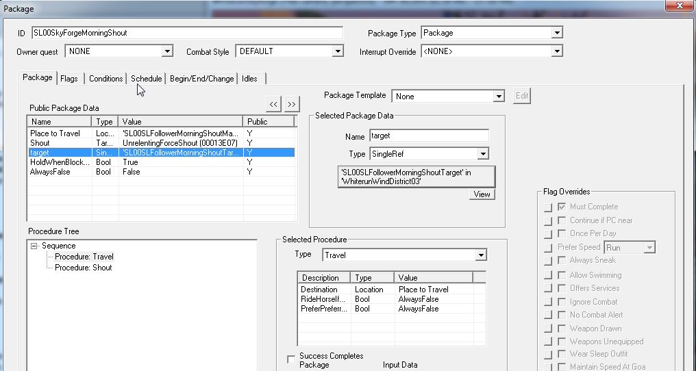 最初「Shout」というPackageTempleteを使ってテストしてみたのですが、どうもこれ、シャウトの立ち位置まで「target」に指定されたオブジェクトを見つめながら移動するようです。日常のスケジュールで使うには少々不自然だったので、立ち位置までは「Procedure:Travel」で移動させることにしました。