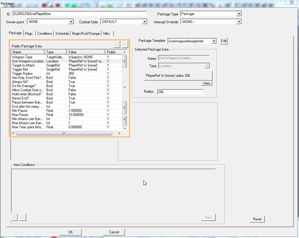 - Allow Start Combat on Hit?:攻撃が当たったら戦闘を開始するかどうか。今回はプレイヤーを殴っているので多分関係ありませんが、相手がNPCだったとき敵対するかどうかの設定です。