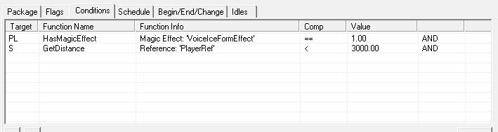 それから、プレイヤーが誤爆を受ける危険があるのはドヴァキンをフォロワーにしているときに限らず、彼と一緒に戦っているときですので、そこそこ近くにいるなら助けに来ていただきます。Radius3000以内にいるときを条件に追加。またこの条件をつけることで、ドヴァキンを仲間にしていないとき別のフォロワーによる氷晶の誤爆を受けても、彼がはるか遠くの待機場所からこちらに駆けつけてくることもなくなります。来てくれてもいいのですが、不自然な行動にはなるのでこういった状況も一応考慮に入れました。