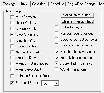 Flagsタブは無難な感じに。おしゃべりやランダム会話せず、さっさとプレイヤーの近くにいって殴ってもらわなくてはなりません。「Ignore Combat」にチェックを入れると、直後に別の戦闘が始まっても氷を壊すのを優先してくれます。