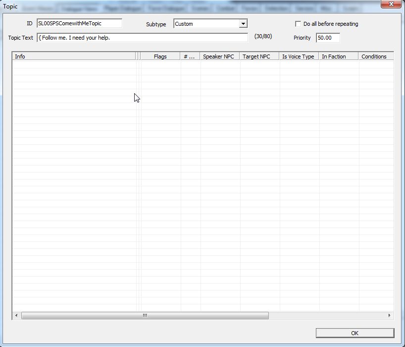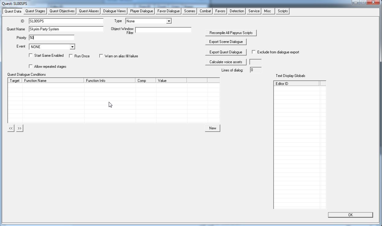 Priorityは50。もしセラーナをこのクエストで雇用したい場合は、Priorityを80以上にしないといけません。彼女の行動全てが、優先度80のセラーナ専用クエストで制御されているからです。シセロや闇の一党の新人も専用クエスト(DarkBrotherhood)で雇用が制御されているので、69以上が必要です。優先度はあまり高くしすぎると、他クエストの競合がでるので悩ましいところではあるのですが。