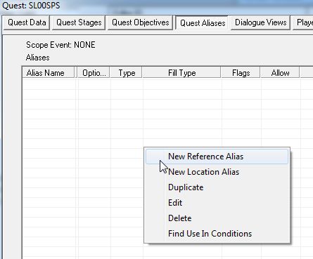 「Optional」は、このAliasが空でもQuestが開始できる設定です。一般にQuestは、設定されているAlias全てが満たされないと(必要な役者や小道具が揃わないと)開始されません。この項目にチェックを入れてると、Quest開始に必須のAliasでなくなります。フォロワークエストでは、雇用して初めてAliasにNPCが入るので、全てのAliasにこのチェックが必要になります。