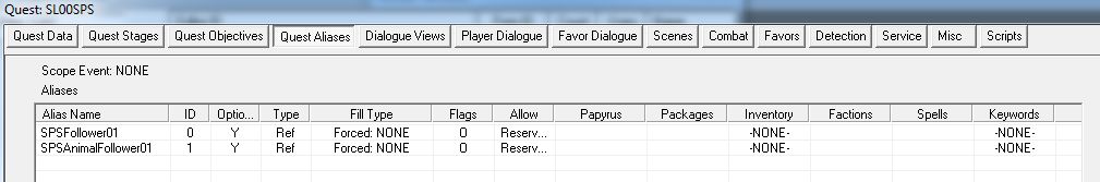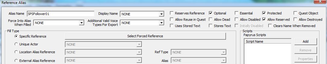 「Allow Reserved」は、他のQuestで「Reserved」にチェックが入っている予約済みのNPCをAliasにぶち込むのに必要です。予約済みとなっているNPCは別QuestのAliasに入れられるのを拒否するので、できる限り色々なNPCをフォロワーに誘いたい場合、このチェックは必須です。Questの開始が「Start Game」となっていると、この項目は暗転して設定ができません。