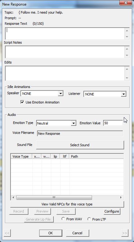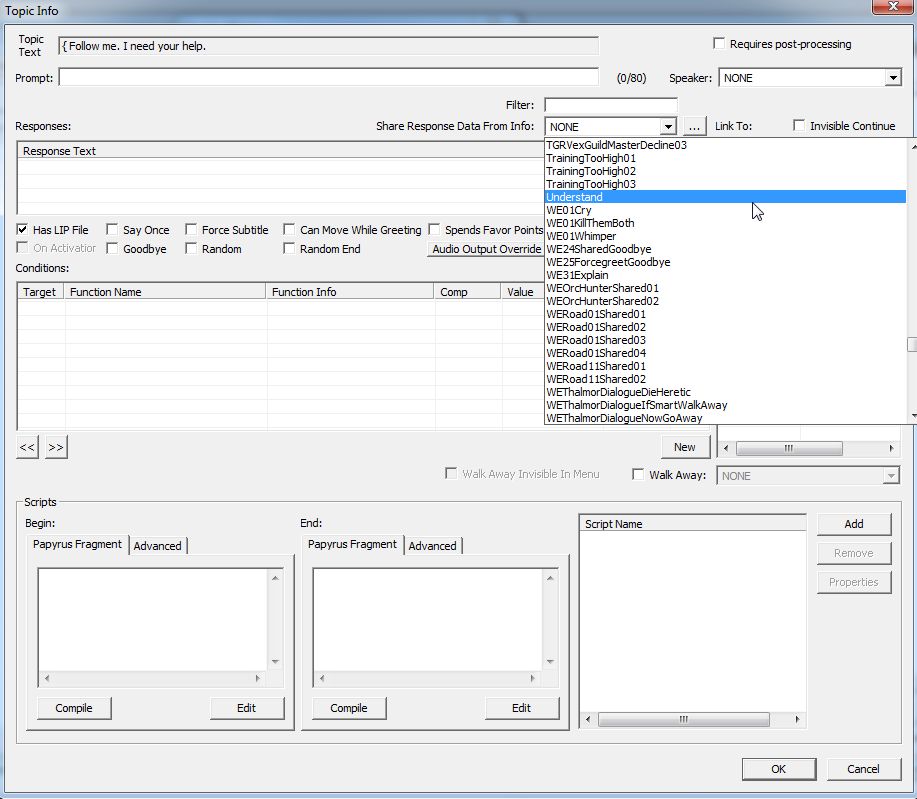 ここの「Share Response Data From Info」 から、他のQuestでShared Infoとして登録された使い回しのきくセリフを選ぶことができます。多くは特定のクエスト絡みでボイスタイプも限定されていますが、中には汎用ボイス全てで使えるセリフあります。音声ファイルをせっせと用意しなくて済むので、作業負担が軽くなります。