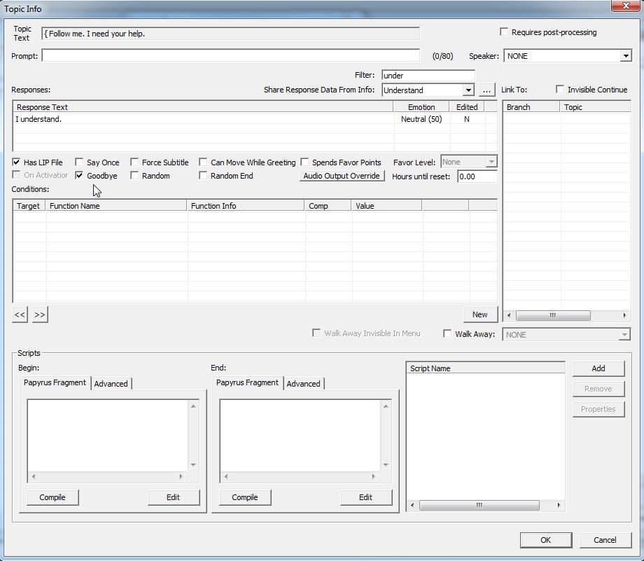 Conditionsを何も設定していないので、スカイリム全土の会話可能な全てのNPCにこのダイアログが追加されるはずです。
