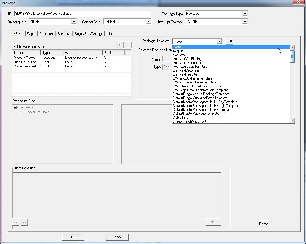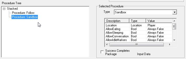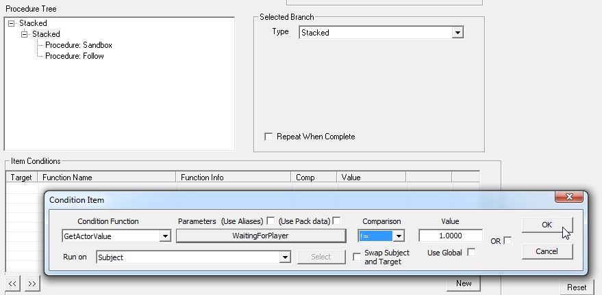 Item Conditionsは消して、「Selected Procedure」にてLocationを"Wait Location"に変更。あと、寝るのもOKにしてあげます。