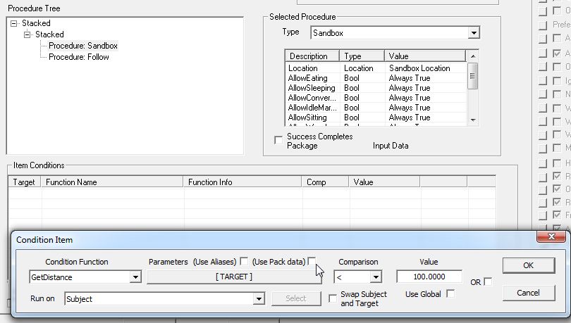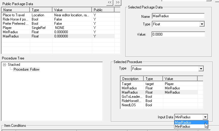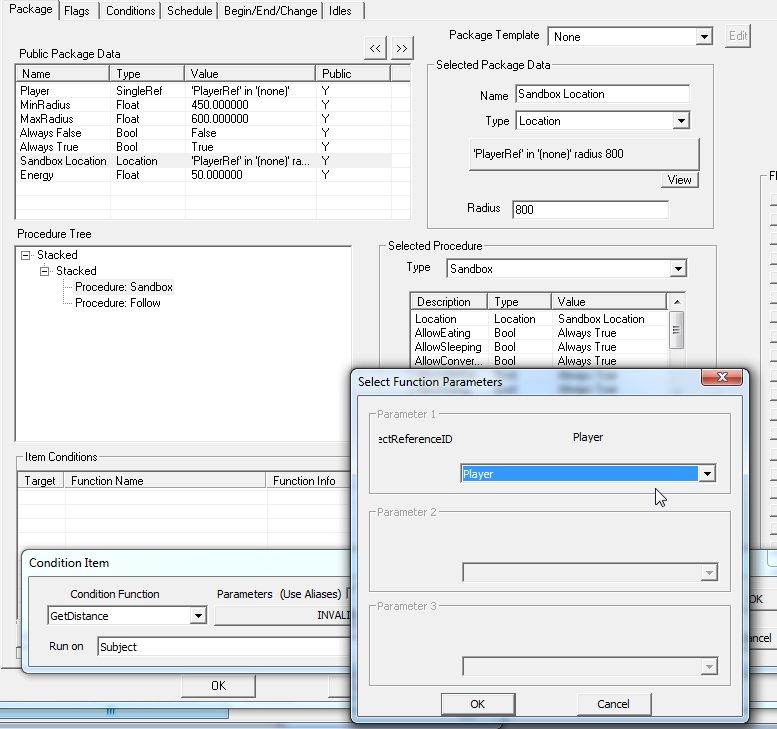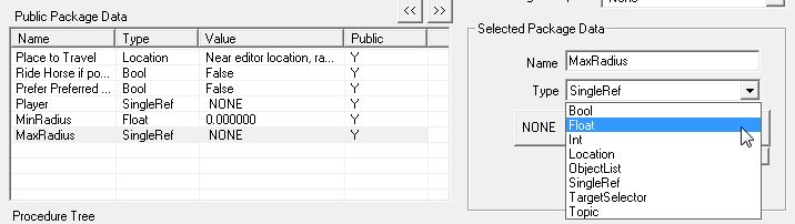 こんな風に、Condition Fuctionで使える「Public Package Data」内の項目が列挙されて選べます。GetDistanceに使えるのはSingleRefタイプの"Player"だけなので、選択の余地はないのですが。
