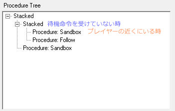 ProcedureTreeの構造はこんな感じになります。注釈がついていないProcedureにはなんの条件づけもしていないので、自分より上位のProcedureやBranchが条件判定でFalseになったとき、必ず実行されるようになっています。