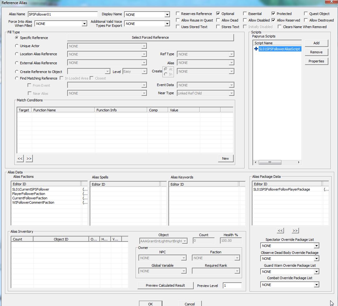 ScriptはExtend: ReferenceAliasです。Script名は「SL01SPSFollowerAliasScript」にしました。Propertyは何も設定しません。