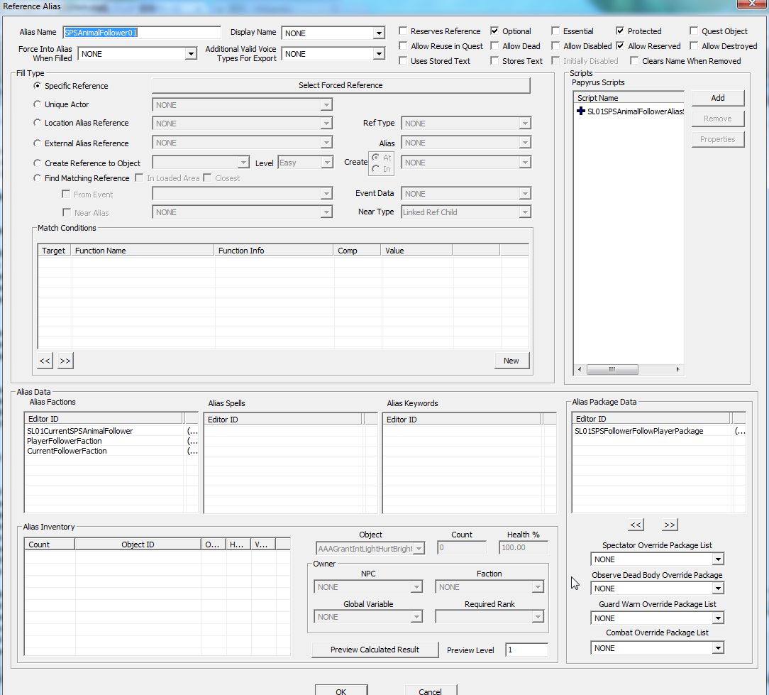 Alias Package Dataに、フォロワー用AI PackageをAddします。次にAlias Factionsにて、自作のCurrentFollowerファクションをAdd。